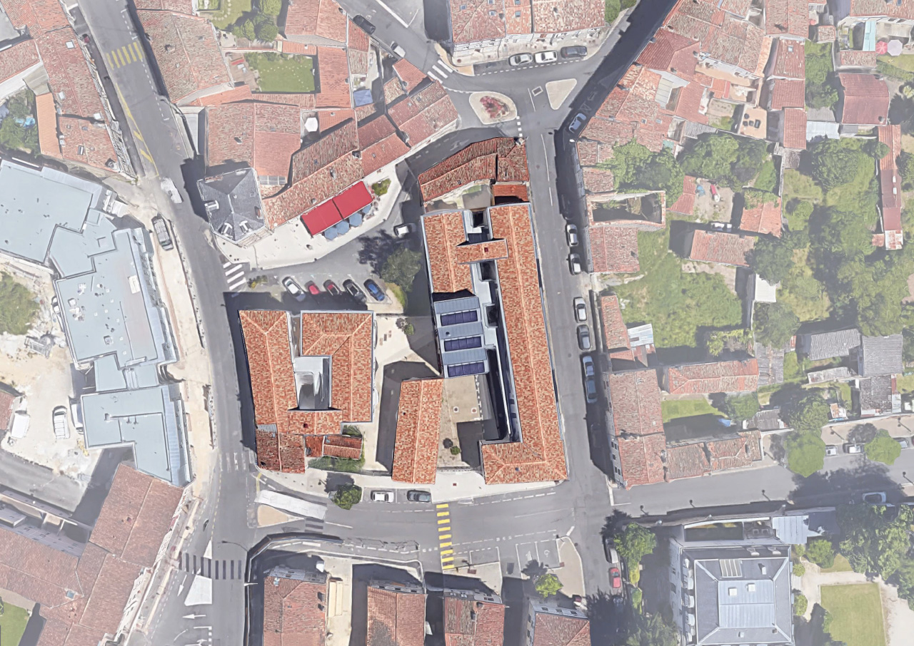 L’ensemble du plan de masse en îlot offre de multiples vues pénétrantes sur des espaces verts au coeur du projet et nous reprenons l’idée du passage urbain privé appelé passage St Cybard qui s’ouvre sur la nouvelle place du Canal. Les bâtiments conservés sont surhaussés dans l’îlot B avec des planchers neufs et offrent un espace de réception et de partage extérieur ouvert et couvert dédié aux étudiants . Les bâtiments neufs sont revêtus de pierres blanches coquillées avec un calepinage libéré des contraintes de construction. Une modénature rythmée par le jeu des fenêtres reprend le dessin des façades traditionnelles locales et les transforme en une image plus contemporaine.